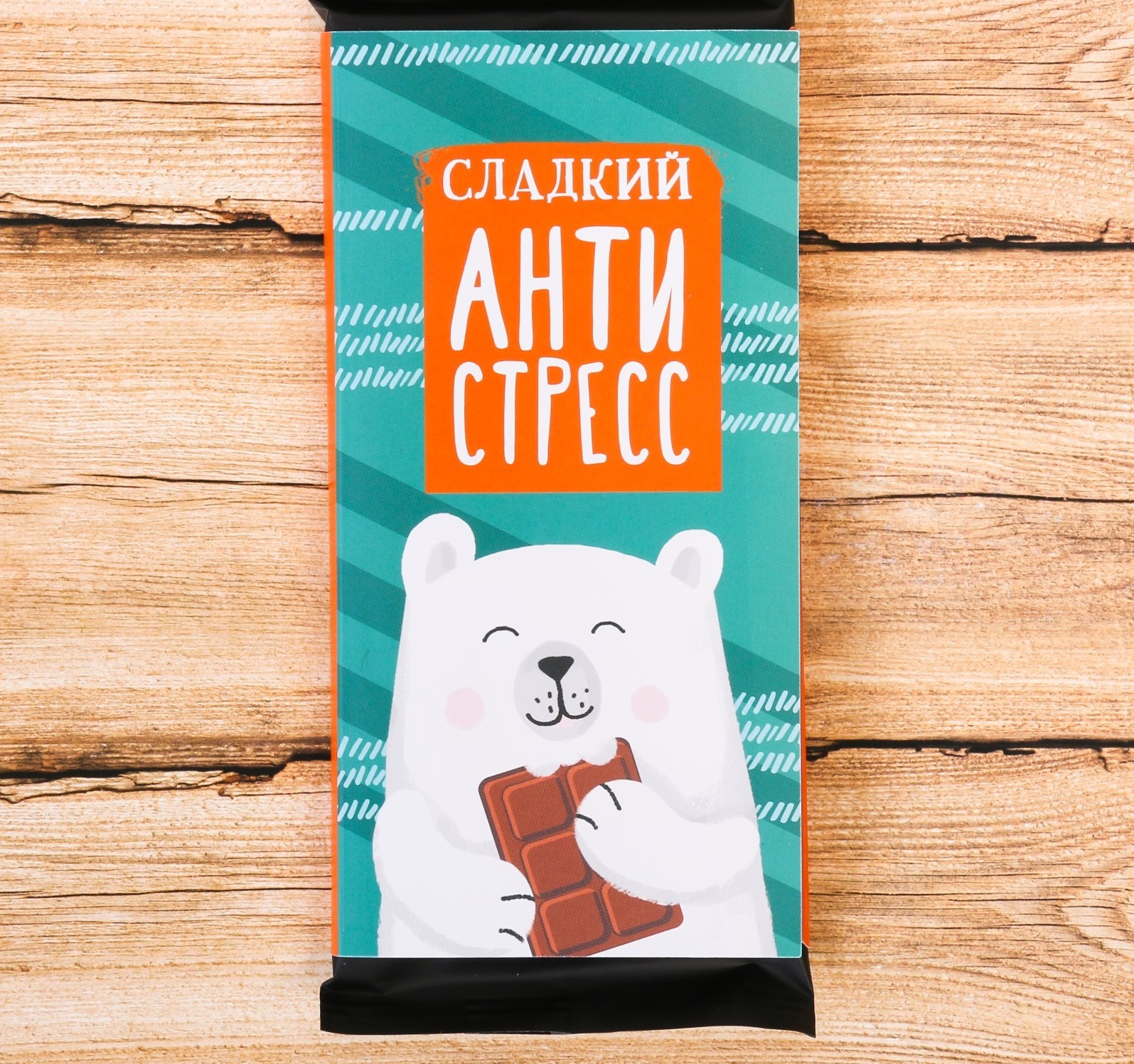 Обертка для шоколада, выполнена из матовой гладкой дизайнерской бумаги с весёлым принтом. Сладкий презент, завернутый в красочную обертку с декором в виде милого медведя с надписью обязательно понравится адресату и поднимет настроение!