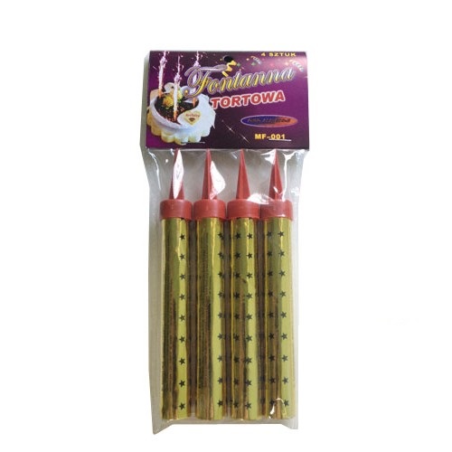 Фонтан - это фейерверк, бьющий вверх переливающимися искрами. Обустройство фонтана, конечно, не позволит его задуть, как свечу на торте для загадывания желания, но эффектность горения и яркая игра огней, приведет в восторг не только именинника, но и всех гостей. Такая эффектная подача торта даёт фонтану преимущество перед восковыми свечами. Фонтаны безопасны для Вашего торта. Не дымят, не оставляют следы пепла и копоти. Просты в использовании, благодаря колпачкам-ножкам их легко воткнуть в торт и поджечь. Конечно, не стоит забывать о том, что фонтаны для торта - всё таки небольшое пиротехническое изделие, с которым необходимо обращаться с осторожностью. Нельзя к нему наклоняться и устанавливать вблизи с легковоспламеняющимися предметами и вещами. Комплект из четырёх свечей-фонтанов.